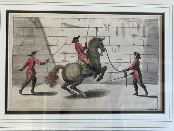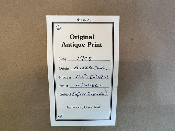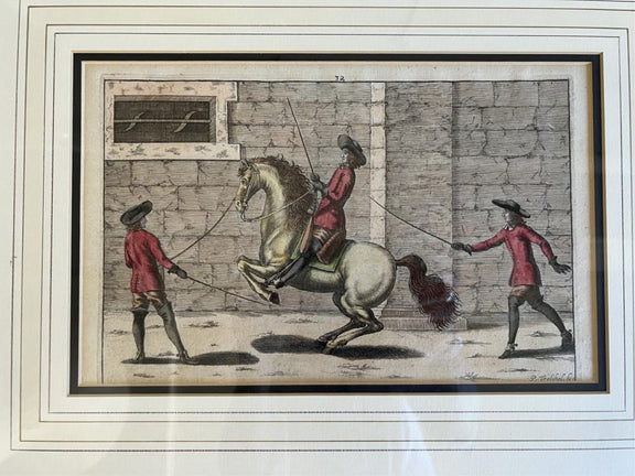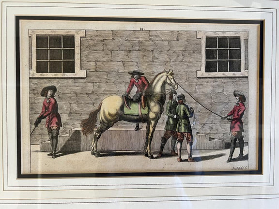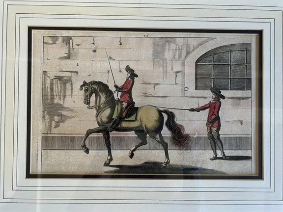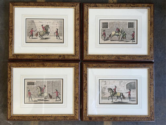Exquisite set of 4 framed German equestrian engravings, crafted by various talented artists. Dimensions: 19.5" H x 24" W - a perfect addition to your home décor!