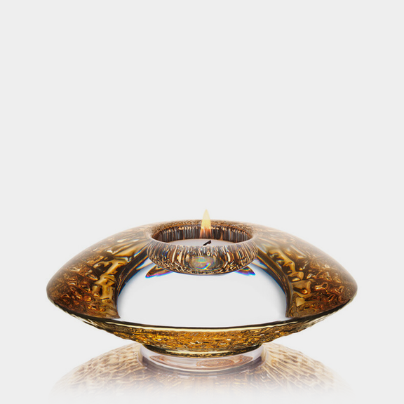 The Discus Votive candle holder in gold from Orrefors has an optical effect in the base, creating beautiful reflections of light in the crystal. Designed by Lars Hellsten.